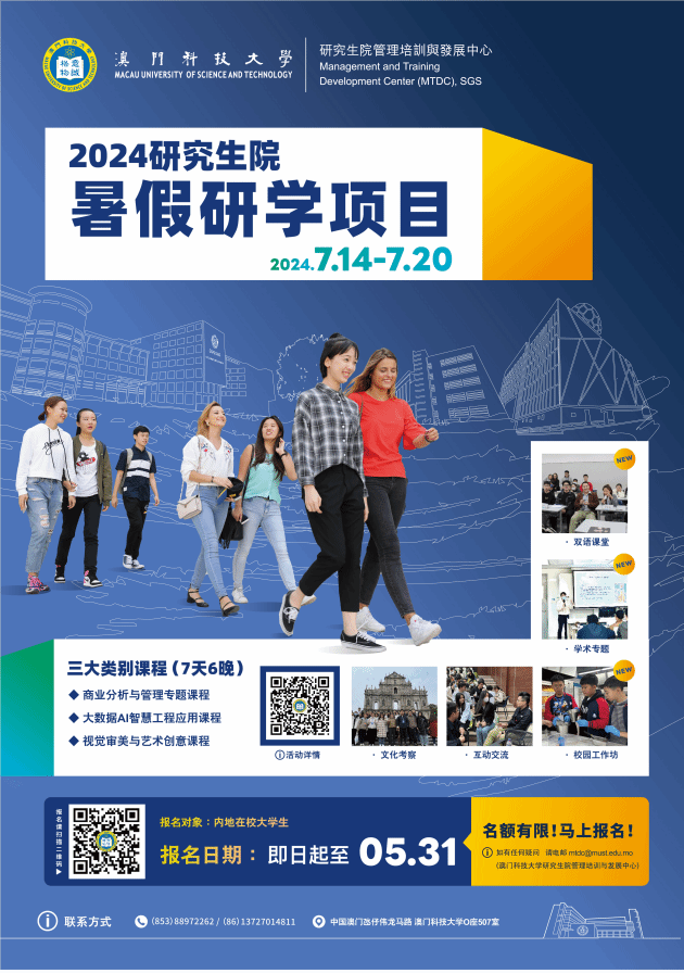 澳门科技大学《2024年暑期研学项目通知》已于3月25日发布在我校国际合作与交流处网站首页“通知公告”中,详情请见网站。此次暑期研学项目校内报名截止时间为5月20日。