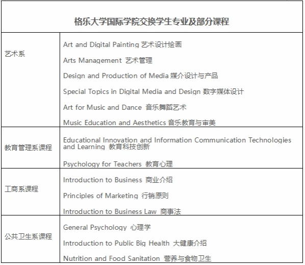 格乐大学国际学院交换生专业及课程:艺术系、教育管理系、工商系、公共卫生系(学生可依据兴趣跨专业选修),以下为各专业授课课程: